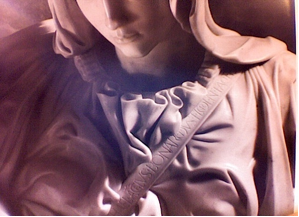 A contenere il bel panneggio sulla figura di Maria c’è una fascia, simile a quelle che nell’antichità erano scolpite per raffigurare gli abiti di Diana. La particolarità della fascia di Maria è che reca un’incisione, niente di meno che l’autografo di Michelangelo: