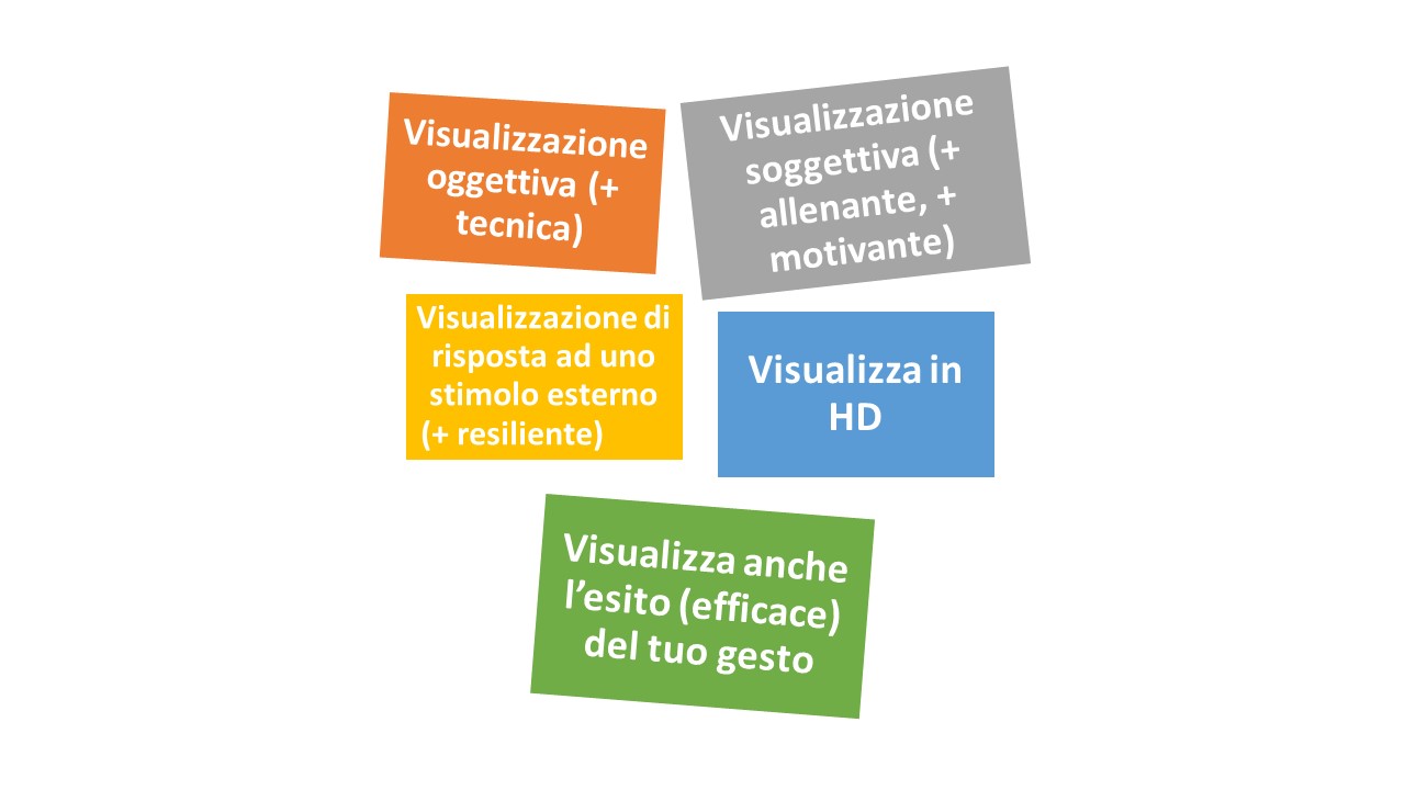 a) nel primo caso, quella della visualizzazione soggettiva, avremo un effetto allenante più efficace. Mi vedo come se stessi giocando, quindi mi alleno. La visualizzazione soggettiva ha anche maggiori implicazioni motivazionali;