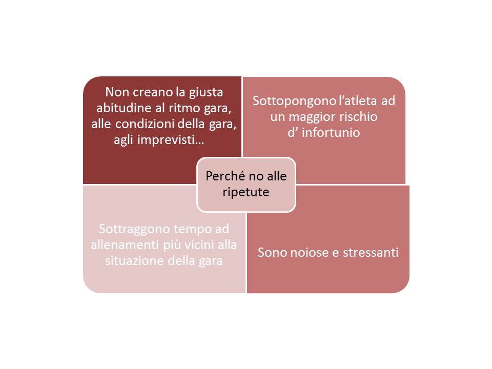 Infine: la struttura muscolo scheletrica di un runner dilettante non potrebbe sopportare, in una fase di carico, ritmi così sparati e distanti dal ritmo gara abituale. Le ripetute sono portatrici sane di infortuni.