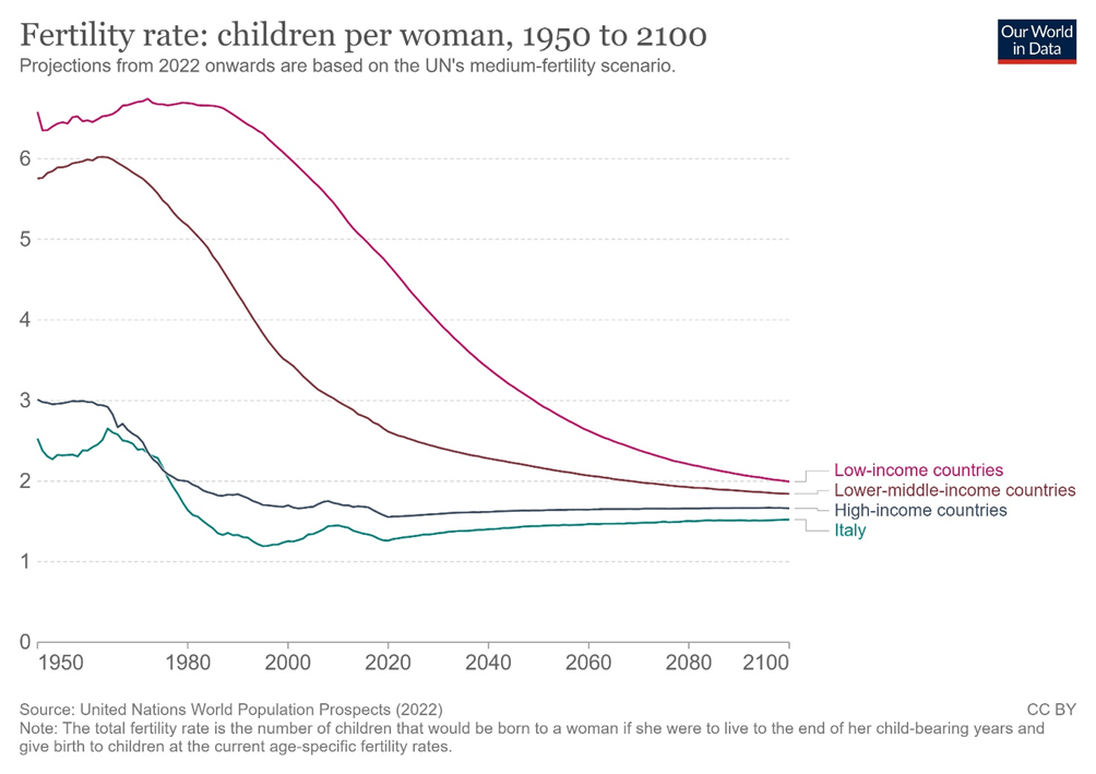Di seguito le proiezioni di fertilità nei Paesi a basso (Low-income countries), medio-basso (Lower-middle-income countries) e alto reddito (High-income countries).